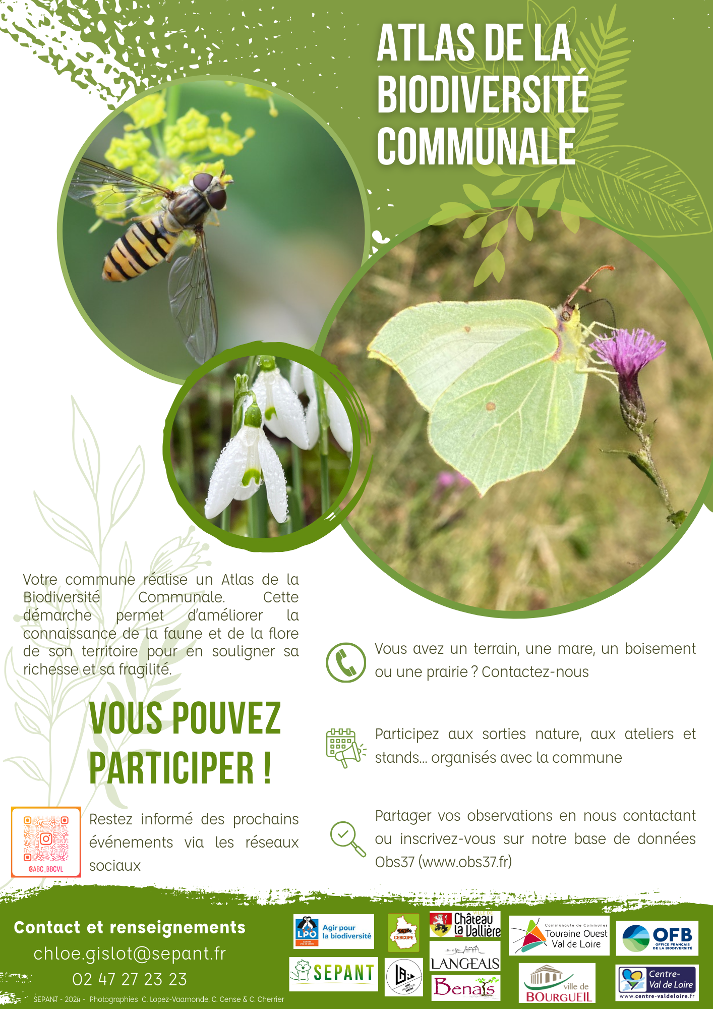 Avec le soutien de la Communauté de Communes, les communes de Benais, Bourgueil, Chateau La Vallière et Langeais s’engagent en 2024 sur un ABC: A comme ATLAS, B comme Biodiversité, C comme Communal. À Benais on démarre avec les amphibiens! Pour mener à bien cette action, nous avons besoin de vous, de votre curiosité, de vos observations, de votre envie de découvrir… et surtout de votre intérêt pour cette action! Contact Chloé Gislot 02 47 27 23 23 chloe.gisolt@sepant.fr Vous pouvez aussi déposer vos observations en ligne sur la plateforme collaborative de la Sepant: Obs37.fr Merci de votre participation à la réalisation de l’ATLAS