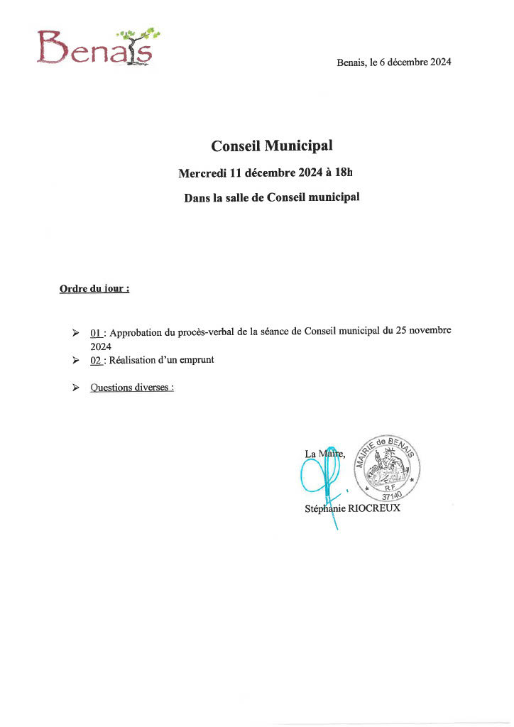 Accueil > Conseil municipal > Conseil municipal du 11 décembre 2024 Conseil municipal retour Conseil municipal du 11 décembre 2024 ⇐ Cliquez sur l’image pour afficher l’ordre du jour