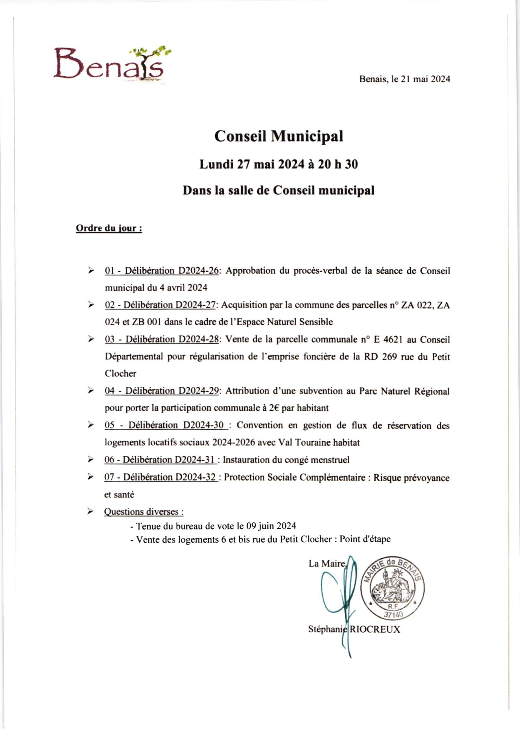Accueil > Conseil municipal > Conseil municipal du 27 mai 2024 Conseil municipal retour Conseil municipal du 27 mai 2024 ⇐ Cliquez sur l’image pour afficher l’ordre du jour