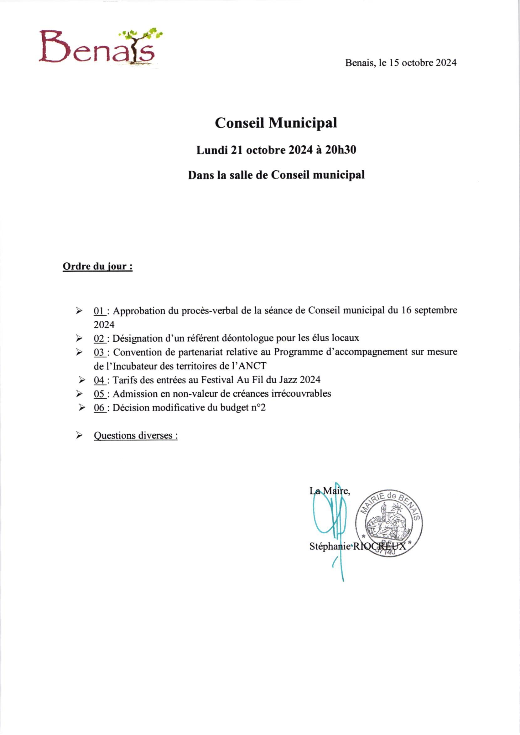 Accueil > Conseil municipal > Conseil municipal du lundi 21 octobre 2024 Conseil municipal retour Conseil municipal du lundi 21 octobre 2024 ⇐ Cliquez sur l’image pour afficher l’ordre du jour