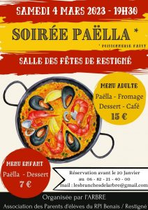 L'association des parents d'élèves ARBRE organise une soirée paëlla (poissonerie FAUST) au profit des élèves du regroupement pédagogique intercommunal Benais Restigné