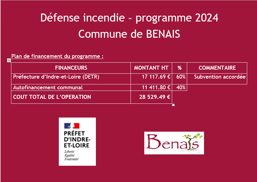 La commune de Benais prévoit un programme de défense incendie en 2024 par la création de 5 nouveaux poteaux incendie :