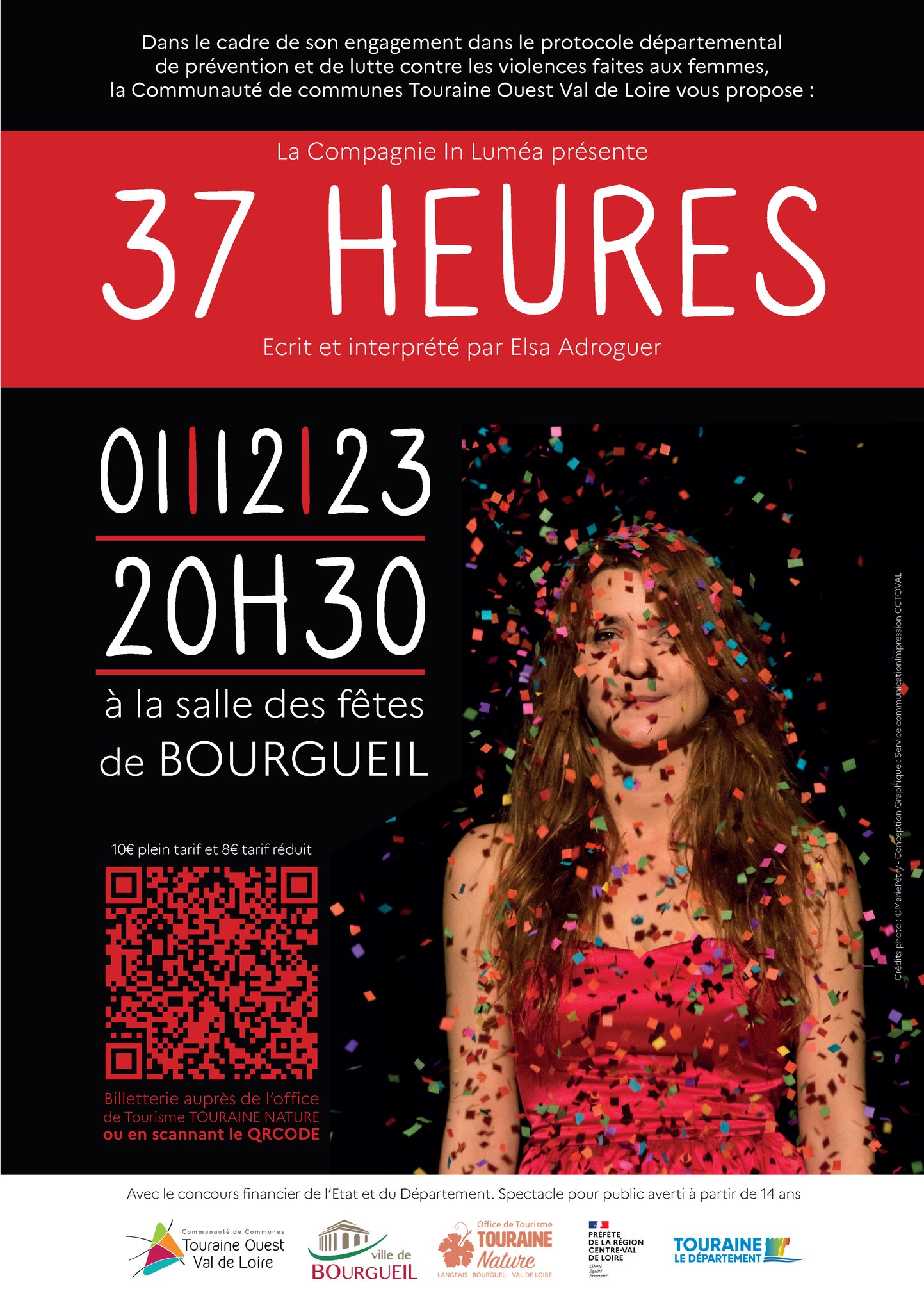 Notre Communauté de communes Touraine Ouest Val de Loire vous propose le spectacle « 𝟯𝟳 𝗛𝗘𝗨𝗥𝗘𝗦 » le 1er décembre à 20h30 à la salle des fêtes de Bourgueil dans le cadre de son engagement au sein du 𝗽𝗿𝗼𝘁𝗼𝗰𝗼𝗹𝗲 𝗱𝗲́𝗽𝗮𝗿𝘁𝗲𝗺𝗲𝗻𝘁𝗮𝗹 𝗱𝗲 𝗟𝘂𝘁𝘁𝗲 𝗰𝗼𝗻𝘁𝗿𝗲 𝗹𝗲𝘀 𝘃𝗶𝗼𝗹𝗲𝗻𝗰𝗲𝘀 𝗳𝗮𝗶𝘁𝗲𝘀 𝗮𝘂𝘅 𝗳𝗲𝗺𝗺𝗲𝘀 𝗲𝘁 𝘃𝗶𝗼𝗹𝗲𝗻𝗰𝗲𝘀 𝗶𝗻𝘁𝗿𝗮𝗳𝗮𝗺𝗶𝗹𝗶𝗮𝗹𝗲𝘀