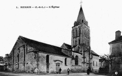 L’église Saint Germain date du XII e siècle. La paroisse de Benais a compté trois bâtiments religieux. L’édifice principal reste, bien entendu, l’église Saint Germain, devant laquelle fut érigé un prieuré aujourd’hui détruit. un second prieuré lié à la paroisse se trouve au lieu-dit Saint Gilles, près du Changeon, le cours d’eau qui irrigue la commune. Le prieuré de Saint Gilles a conservé une tourelle d’angle, ancienne fuie caractérisée par sa décoration de briques et de pierres alternées, couverte d’un toit pointu à facettes. Son clocher est aujourd’hui constitué d’un beffroi à deux étages et d’une flèche octogonale.