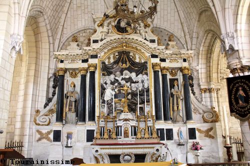 Le chœur à chevet plat début du XIIIe siècle est constitué du voûte dîtes “angevines” ou “Plantagenêt” et la partie plate est occupée par un retable imposant comportant une représentation de la cène. La scène centrale est encadrée par les statues des Saint évêques Germain et René. Le retable peut apparaître comme disproportionné par rapport à l’édifice mais il faut se souvenir qu’une grande partie de  la nef s’est effondrée en 1916. Auparavant l’entrée de l’église Saint Germain se situait tout au bord de la route départementale. Après l’effondrement, il a été décidé de reconstruire une nef dans des dimenseions très inférieures dans sa longueur et dans sa largeur. Une partie des pierres de la nef effondrée ayant été réutilisées, dit-on, à la reconstruction du Foyer Rural.
